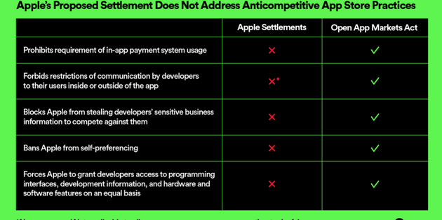 作为回应,Spotify 首席法律官霍拉西奥・古铁雷斯 (Horacio Gutierrez) 更新了该公司之前制作的一张图表,在“禁止开发者对应用内外用户的通信限制”旁边加了一个星号,上面写着“范围小/不适用于所有应用”。