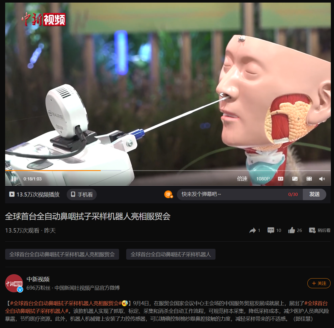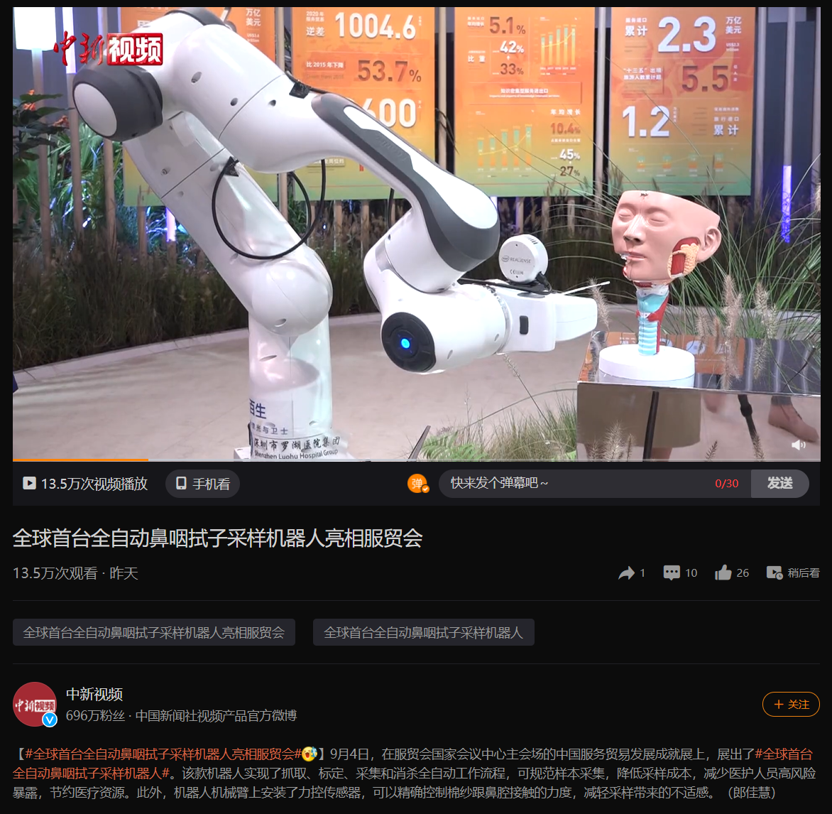 9 月 5 日消息 据中国新闻社报道,在 9 月 4 日的中国国际服务贸易交易会上,中国服务贸易发展成就展中展出了全球首台全自动鼻咽拭子采样机器人。